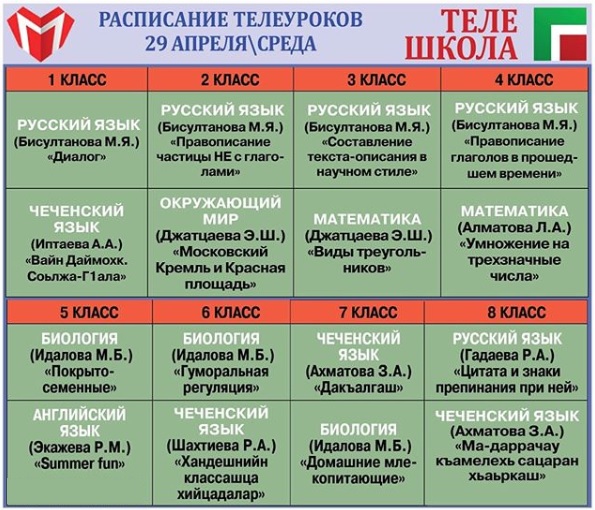 27.04.2020Расписание телеуроков для школьников на понедельник 27 апреля. Занятия продолжительностью до 10 минут начинаются в 9.00. Отметим, что все образовательные выпуски телепроекта доступны для просмотра на сайте Министерства образования и науки ЧР. Напомним, что в эфире ЧГТРК «Грозный» продолжается реализация проекта Министерства образования и науки Чеченской Республики «Телешкола», в ходе которого лучшие учителя республики в процессе занятий не только объясняют наиболее сложные темы, но и помогают школьникам и их родителям сориентироваться в учебной программе.