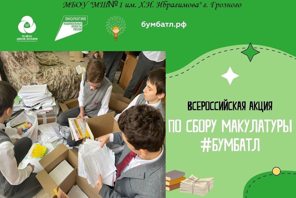 10.11.2022Учащиеся и сотрудники МБОУ «МШ№1 им. Х.И. Ибрагимова» г. Грозного приняли участие во Всероссийской акции по сбору макулатуры #БумБатл. Цель Акции - формирование экологической культуры у подрастающего поколения. Напоминаем, что данная акция организуется третий год подряд в поддержку национального проекта "Экология", её участниками стали не только школы, но и детские сады, средние профессиональные и высшие учебные заведения, компании и активисты. Благодарим всех за участие в акции!