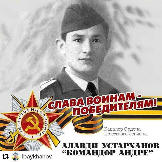 Об этом человеке почти ничего не было известно в Советском Союзе.Об Алавди Устарханове – герое французского Сопротивления. В 1941 году совсем юный житель из Ачхой-Мартана в числе тысяч добровольцев ушел на фронт. Тогда никто не мог знать, что через несколько лет его имя узнает вся Европа, и на многие годы предаст забвению - Родина. Его звали до войны – Алавди Устарханов.А звание командора Андре он получит потом и навсегда….Он несколько раз убегал из концентрационного лагеря, в который он попал с тяжелой контузией. Натасканные на человека овчарки, приводили преследователей к беглецам. Несмотря на пытки и истязания Алавди убегал от немцев. Очередной побег оказался для многих последним. Только двое смогли убежать – это раненый французский солдат и Алавди.Алавди шел и шел, нося на спине раненого, для него было главным добраться до горных троп… Ему удалось спасти своего друга и отдать его в руки бойцам антифашистского движения Сопротивления.И Алавди остался с ними. Воевал он бесстрашно, на его счету было много дерзких операций. Его имя обросло легендами, и для французского сопротивления он стал любимцем - командором Андре.На мотоцикле он врывался в захваченные немцами населенные пункты, подъезжал к штабу, и в упор расстреливал фашистов.Генерал Де Голль лично вручил храброму чеченцу орден Почетного легиона.