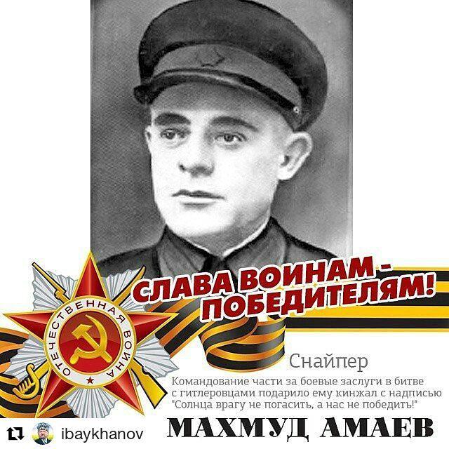 Мужество и отвагу в боях с фашистами проявил бывший учитель из горного села Химой Шатоевского района Махмуд Амаев. Командование воинской части за боевые заслуги в битве с гитлеровцами подарило ему кинжал с надписью "Солнца врагу не погасить, а нас не победить!" Рабочие Тульского оружейного завода изготовили для отважного снайпера именную снайперскую винтовку. В Москве на выставке "Комсомол в Великой Отечественной войне" экспонировалась табличка "Личный счет снайпера гвардейца младшего сержанта Махмуда Амаева": на его счету уже в то время было 177 убитых фашистов. Махмуд Амаев пал смертью храбрых 22 февраля 1943 года