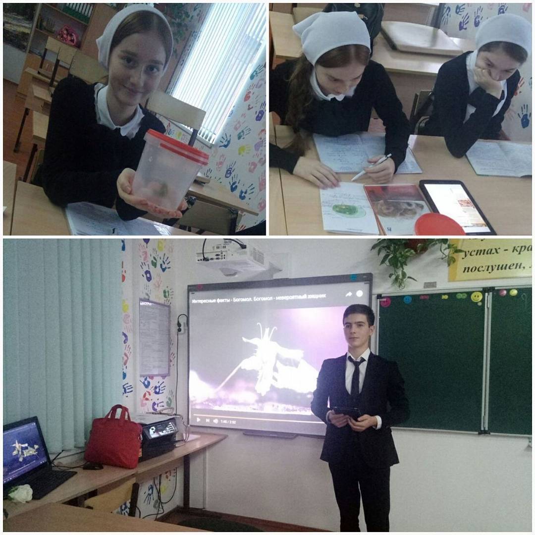 Сегодня на практико-ориентированном уроке по биологии в 10 классе (учитель Амерханова М.Ш.) учащиеся познакомились с особенностями обмена веществ. В качестве одного из примеров Джаубатыровым Исламом была представлена информация об обмене веществ у богомолов. Для наглядности был продемонстрирован и сам богомол, после чего был отпущен на свободу.