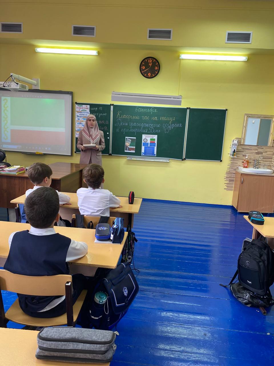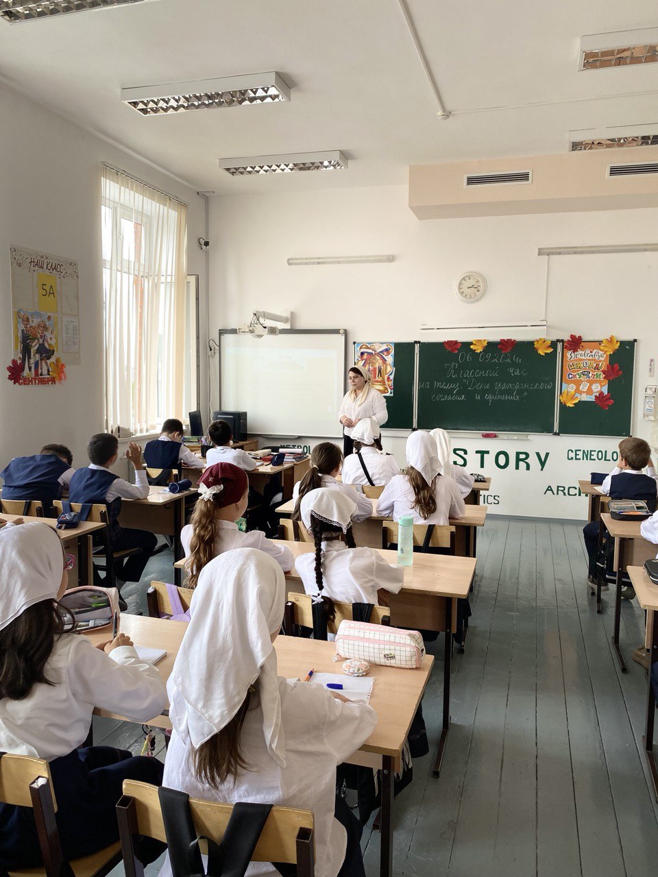 Открытые классные часы прошли в 4 А (Бельтиева Х.Ш) и в 5 А (Кагерманова Л.У) классах. Также прошла выставка рисунков и фотографий на тему: «Республика в единстве поколений» Такие мероприятия способствуют развитию терпимости и корректности в общении с окружающими, учат быть добрее и более внимательными друг к другу.