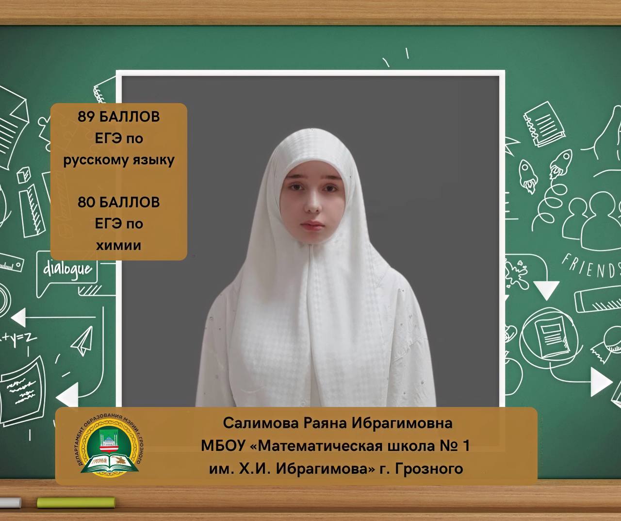 03.09.2024Салимова Раяна Ибрагимовна, ученица МБОУ «Математическая школа № 1 им. Х.И. Ибрагимова» г. Грозного, набрала на ЕГЭ 89 баллов по русскому языку и 80 баллов по химии.