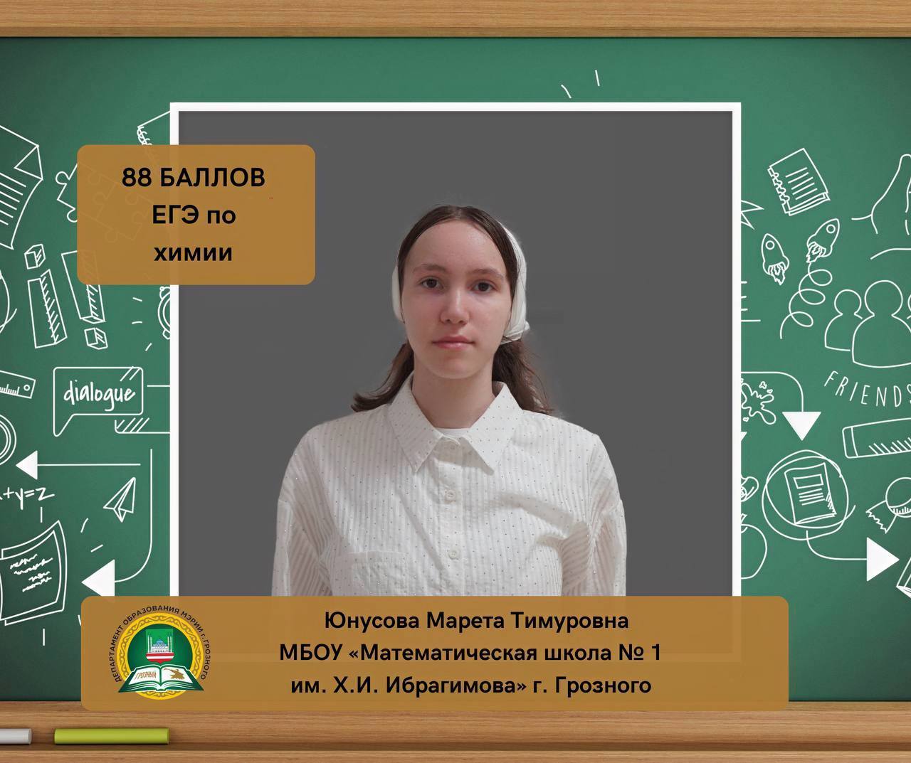 03.08.2024Юнусова Марета Тимуровна, ученица МБОУ «Математическая школа № 1 имени Х. И. Ибрагимова» г. Грозного, набрала 88 баллов на ЕГЭ по химии.