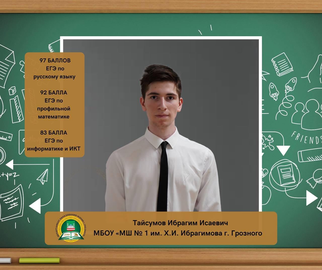 28.07.2024Тайсумов Ибрагим Исаевич, ученик МБОУ «Математическая школа № 1 им. Х.И. Ибрагимова» г. Грозного, набрал на ЕГЭ 97 баллов по русскому языку, 92 балла по профильной математике и 83 балла по информатике.
