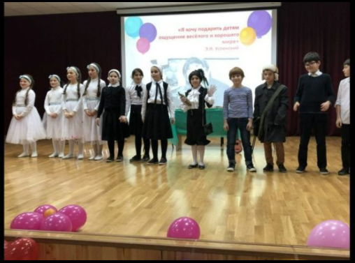 Сегодня, свой 80-летний юбилей отмечает замечательный писатель, сценарист, режиссёр Эдуард Успенский, кумир «мальчишек и девчонок, а также их родителей». Творчество Успенского известно во всем мире, его книги переведены на разные языки. «Я хочу подарить детям ощущение веселого и хорошего мира» - говорил о своём творчестве сам Успенский. Именно так,весело и ярко, прошло мероприятие, посвящённое писателю в актовом зале нашей школы. Ведущие Шапокляк и Печкин весело и задорно провели его. Маленькие зрители отвечали на вопросы, участвовали в музыкальном конкурсе. И доказали таки ворчуну Печкину и вредине Шапокляк, что хорошо знают произведения Успенского. Сценка с героями «Простоквашино» Дядей Фёдором, Шариком и котом Матроскиным вызвала смех и радостные улыбки на лицах детей и взрослых. А замечательные рисунки учащихся 3,4,5 - ых классов украсили мероприятие. Спасибо всем участникам и зрителям за великолепную игру и хорошие читательские знания. Но, говоря словами Эдуарда Успенского, если вы хотите узнать, насколько умнее и лучше становится человек, прочитавший тысячу книг, прочитайте тысячу книг».