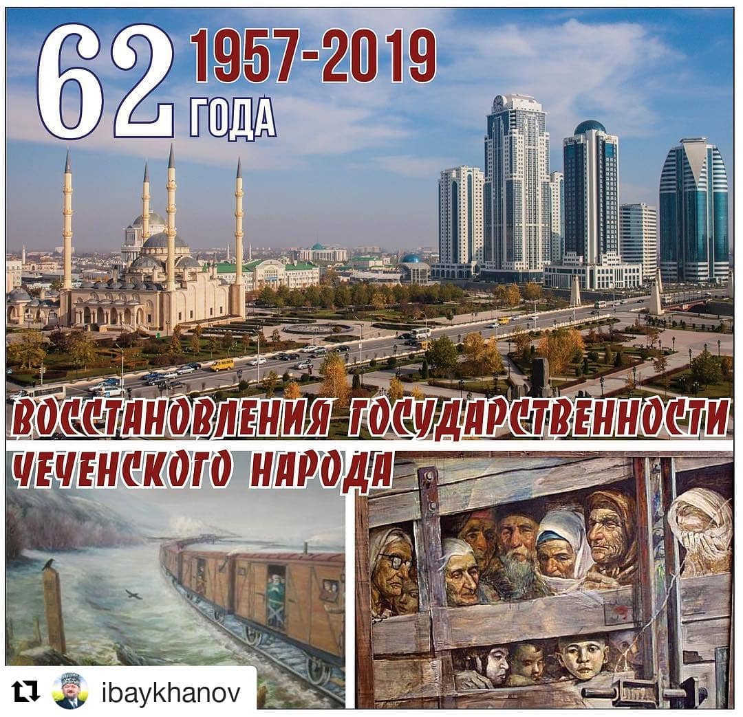 10.01.2019Сегодня мы отмечаем одну из самых знаменательных дат в нашей истории – День восстановления государственности чеченского народа. 62 года прошло со дня издания Указа Президиума Верховного Совета о восстановлении Чечено-Ингушской АССР